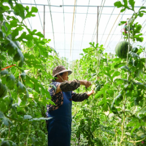 4月17日,在潍坊市昌乐县五图街道,一名瓜农在查看成熟的小型西瓜。