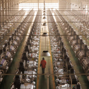 4月17日,工人在贵州省毕节高新技术产业开发区一家纺织企业的生产车间进行生产作业。