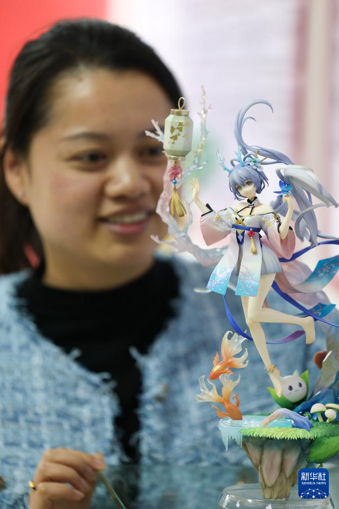 4月17日,一名女工在毕节高新技术产业开发区一家动漫手办生产企业内展示手办。