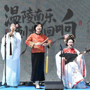 4月17日,在瑞士日内瓦万国宫,来自中国泉州的表演者在表演南音《三千两金》。