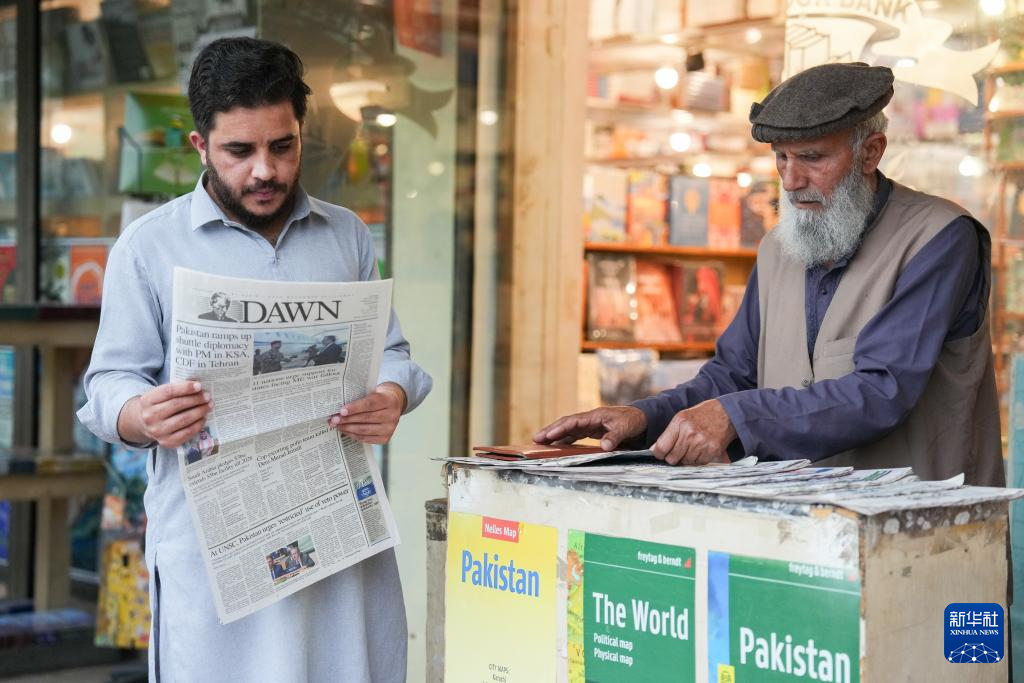 4月16日,一名男子在巴基斯坦首都伊斯兰堡一个摊位前阅读英文报纸。