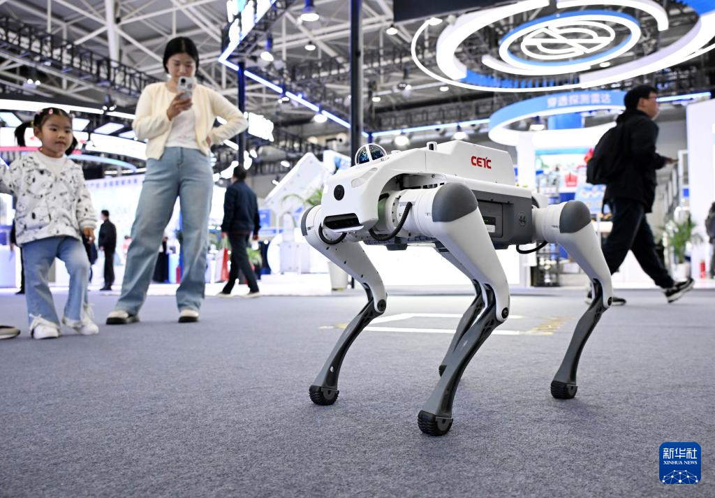 4月18日,一款搭载激光雷达的机器狗在雷达未来大会展览区与参观者互动。