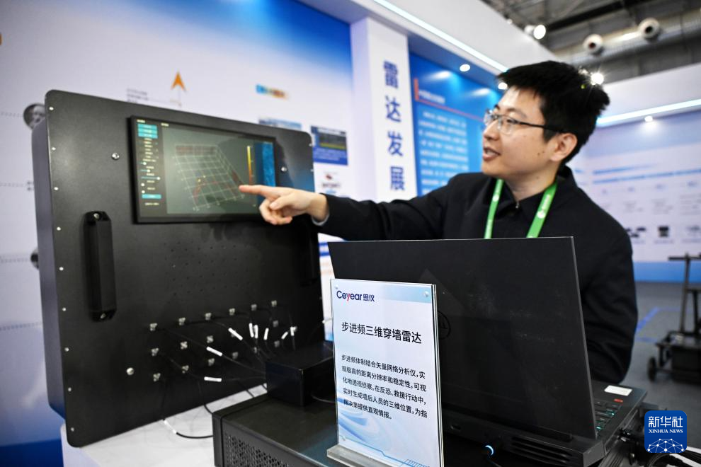 4月18日,一名展会工作人员在介绍穿墙雷达的工作原理。