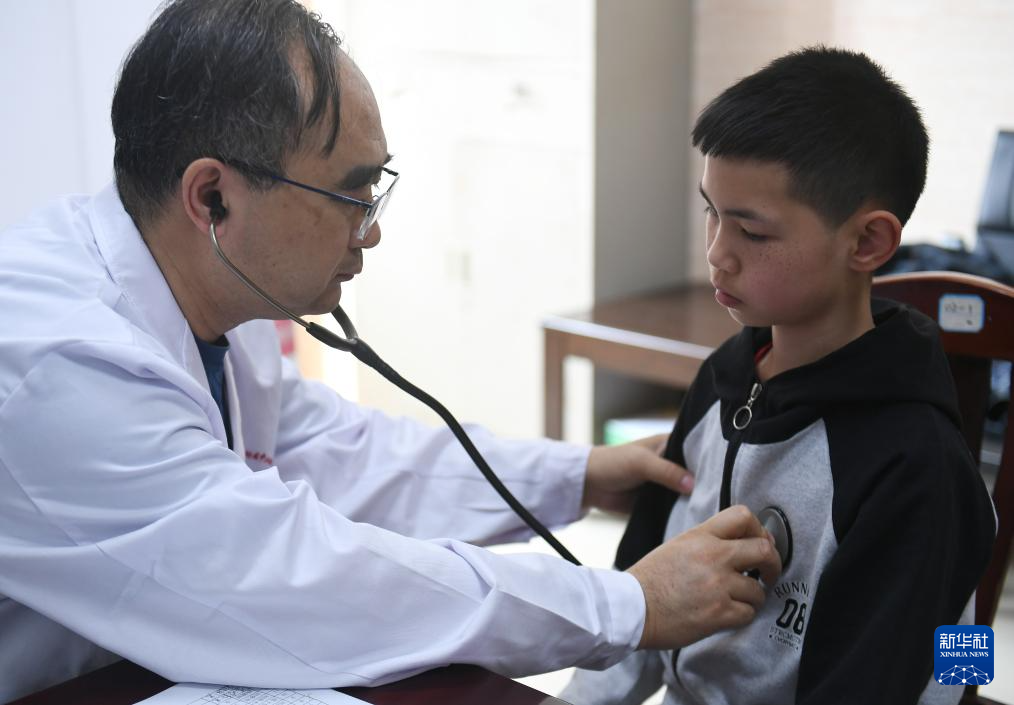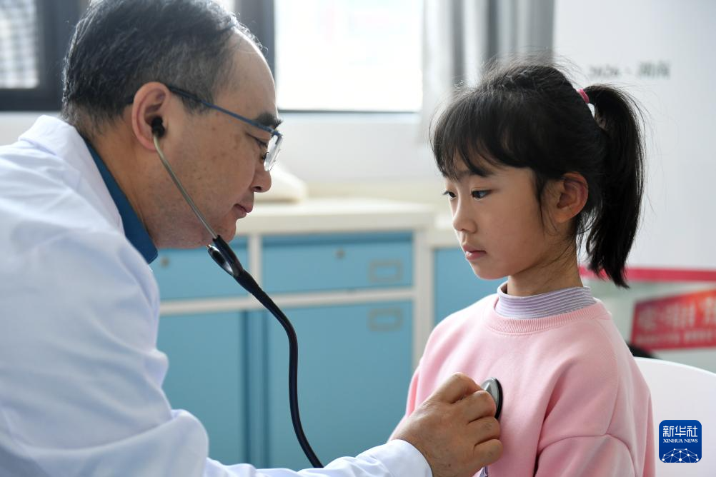 4月18日,在岳阳县人民医院,来自山东第一医科大学附属中心医院的医疗专家为孩子做检查。