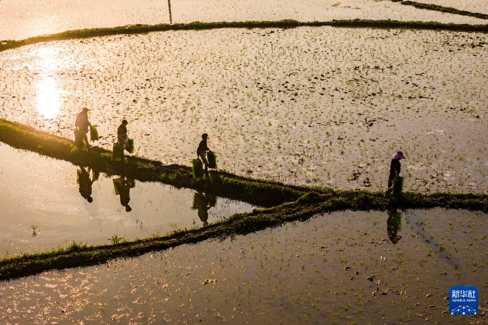 4月19日,在湖南省娄底市双峰县井字镇蒋市村,农民拎着秧苗前往大田准备抛秧(无人机照片)。