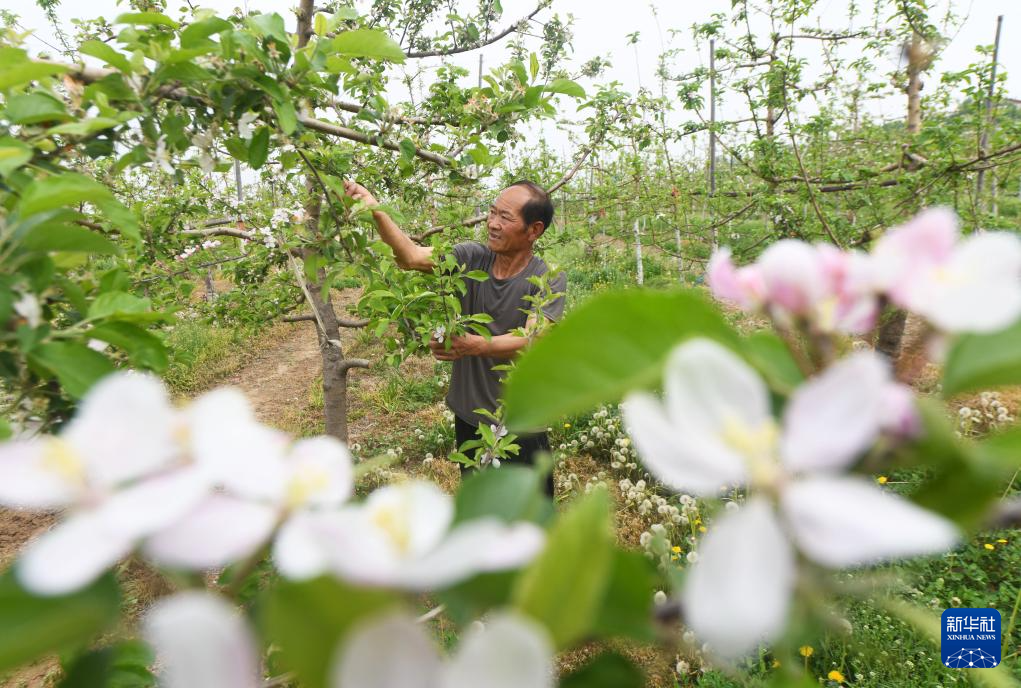 4月19日,在河北省石家庄新乐市邯邰镇大流村,果农为苹果树疏花。