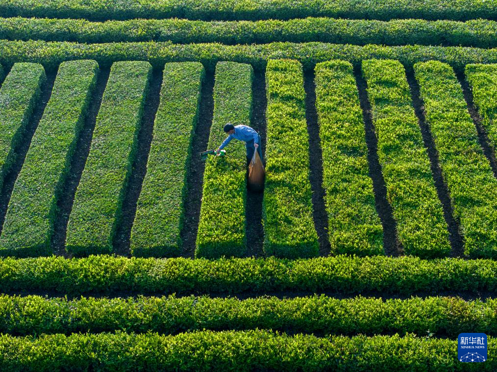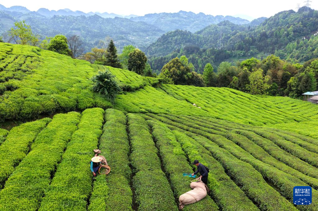 4月19日,茶农在湖北省秭归县茅坪镇松树坳村一生态茶园采收雨前茶(无人机照片)。