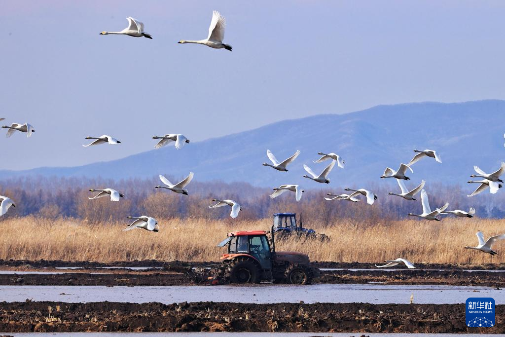 4月18日,在黑龙江省同江市的一处水田里,正在作业的农机和起飞的天鹅同框。