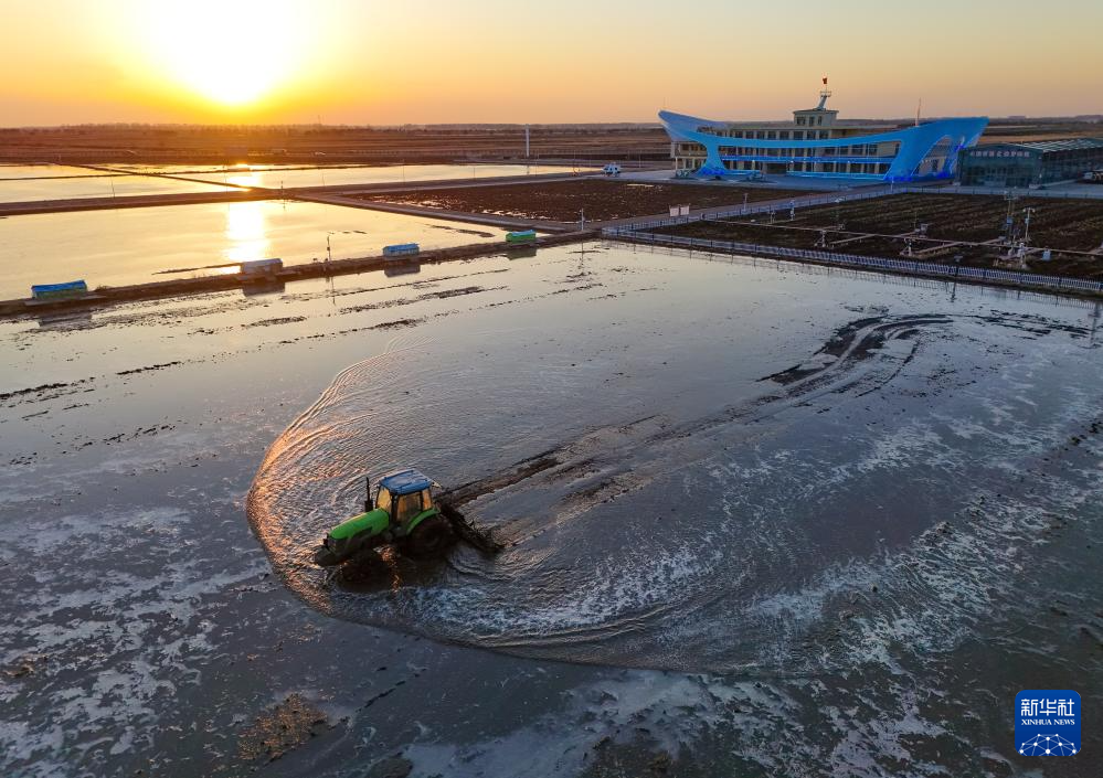 4月18日,在黑龙江省富锦市万亩水稻公园,种植户驾驶农机进行打浆作业(无人机照片)。