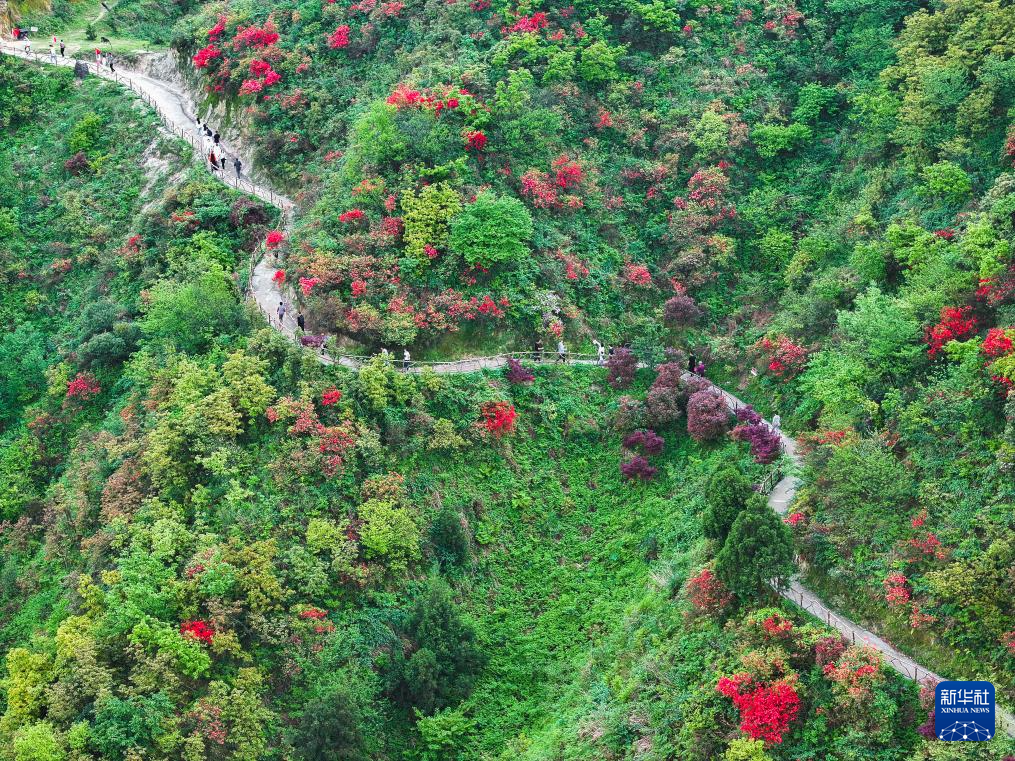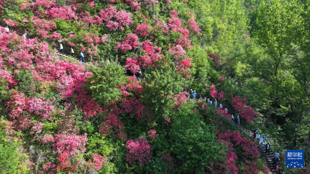 4月18日,河南省洛阳市汝阳县王坪乡孟村七彩杜鹃花绽放,吸引众多游客前来观赏(无人机照片)。
