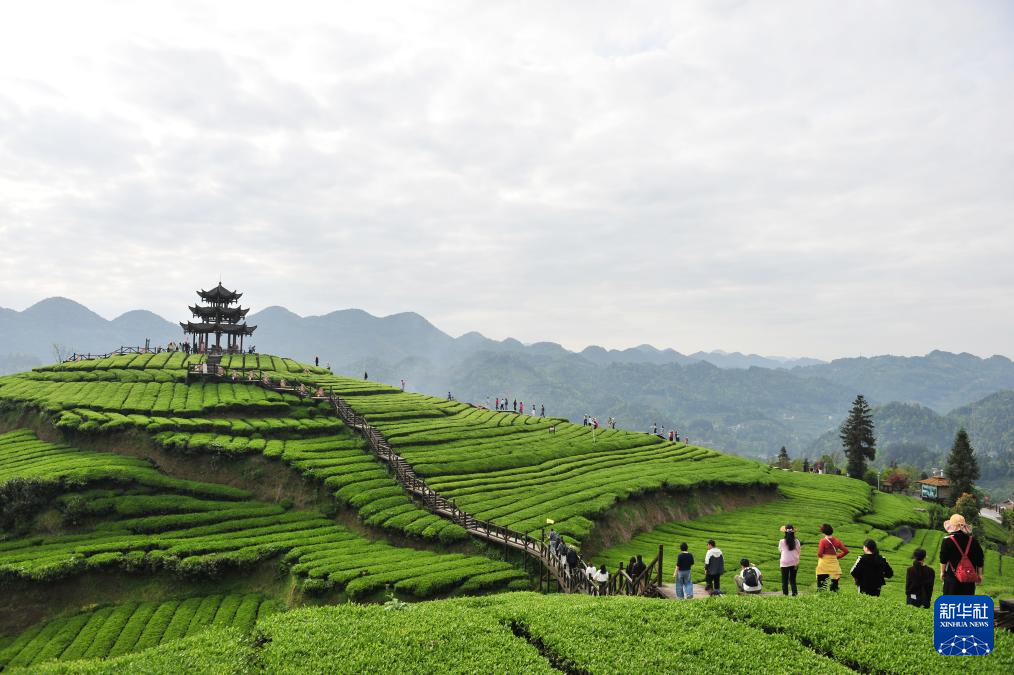4月19日,游客在湖北省宣恩县伍家台贡茶文化旅游区的茶园里游玩。