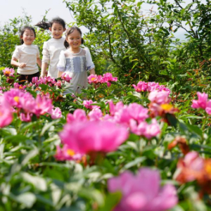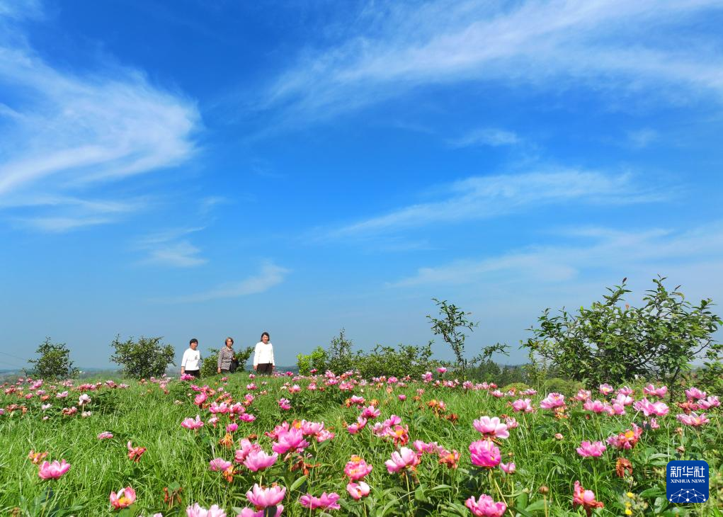 4月19日,游客在湖南省祁东县白地市镇的芍药种植基地打卡游玩。