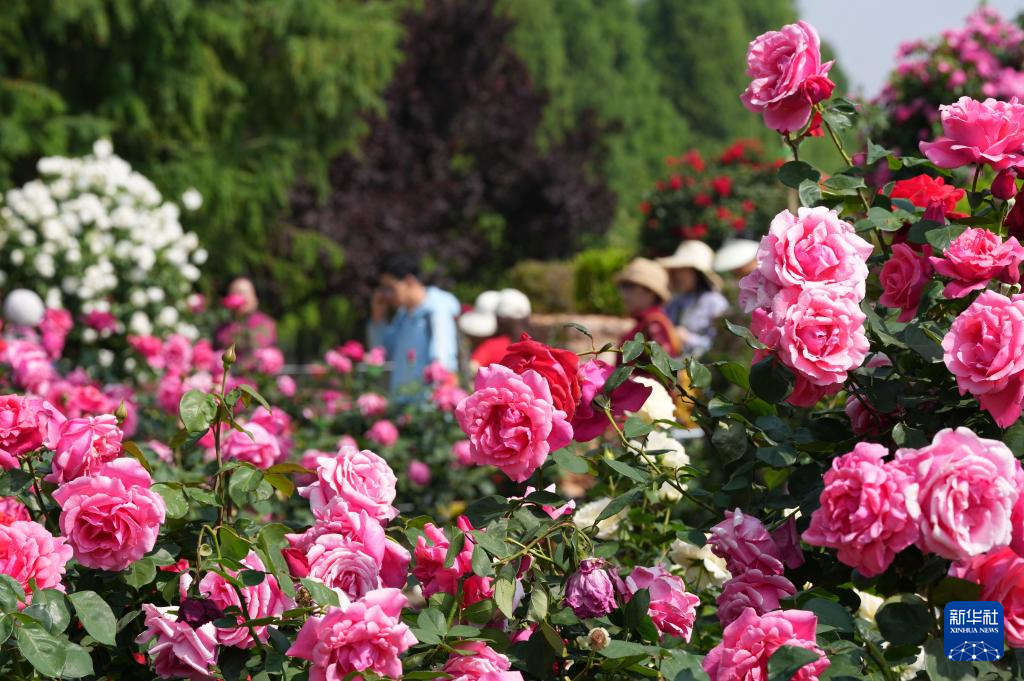 4月18日,市民在昆明市大观公园的庾园内观赏月季花。