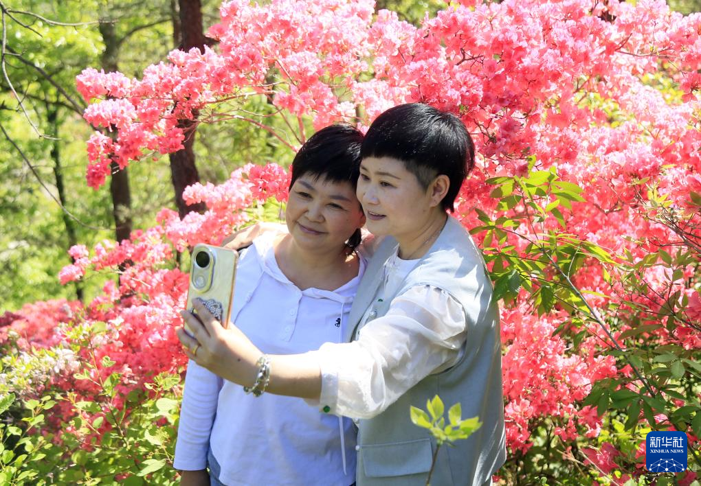 4月18日,游客在河南省洛阳市汝阳县王坪乡孟村杜鹃花前拍照留念。