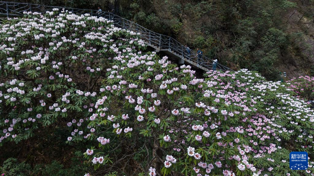 4月18日,游客在四川省眉山市洪雅县瓦屋山景区观赏高山杜鹃(无人机照片)。