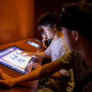 4月17日,美国青年乒乓球队队员在宁夏银川西夏陵博物馆内体验互动游戏。
