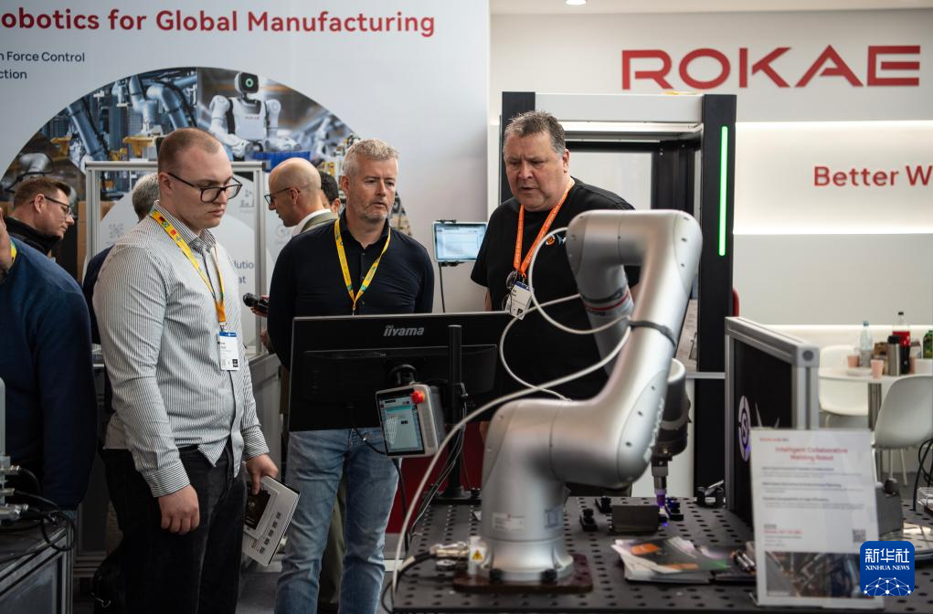 4月21日,人们在德国汉诺威工业博览会珞石展台交流。