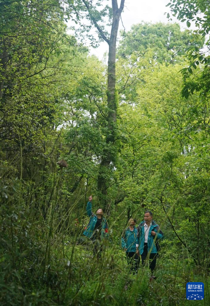在江西省都昌县达子咀村,村民在苍鹭栖息的树林中巡查(4月9日摄)。