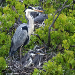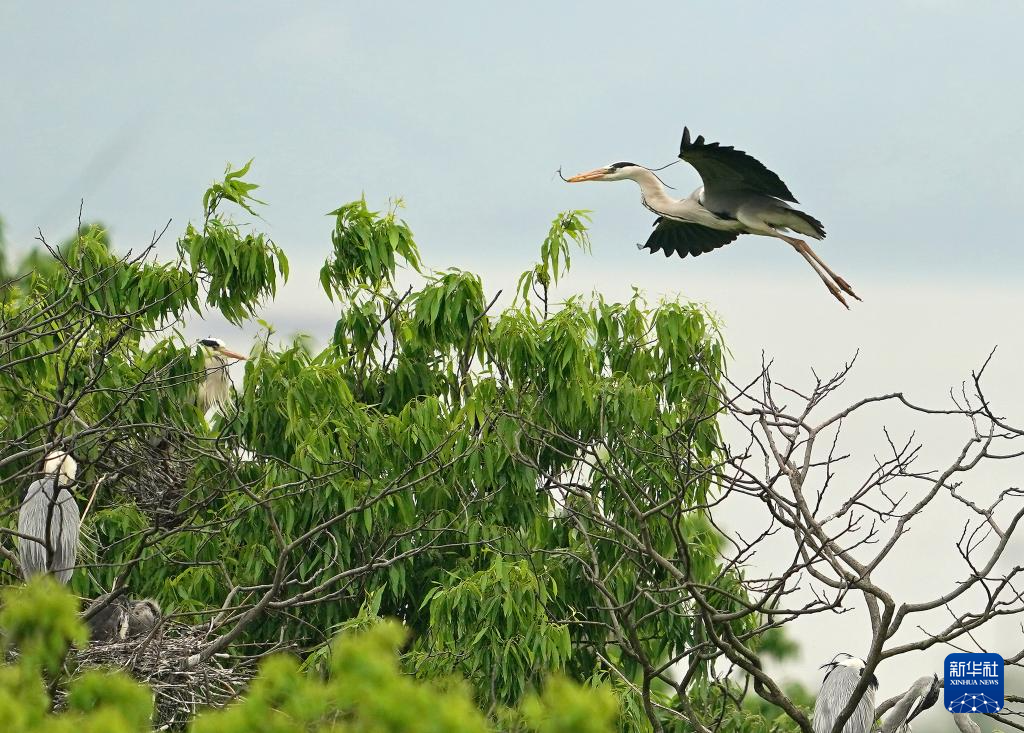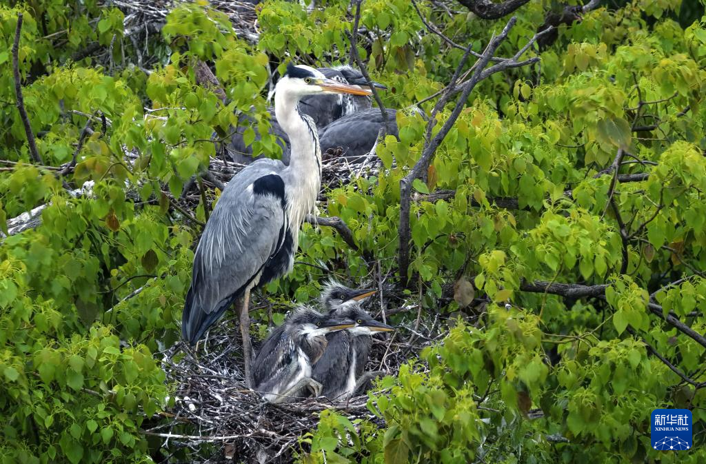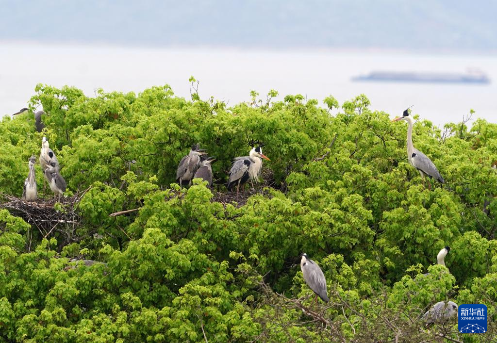 春日里的鄱阳湖,一片生机盎然。在位于江西省都昌县达子咀村的一片湖滨树林里,8000多只苍鹭成鸟栖息于此。它们衔来树枝,有条不紊地筑巢、孵卵、育雏。从刚破壳、浑身绒羽的雏鸟,到已长出灰白羽毛的幼鸟,不同成长阶段的苍鹭错落分布在林间。