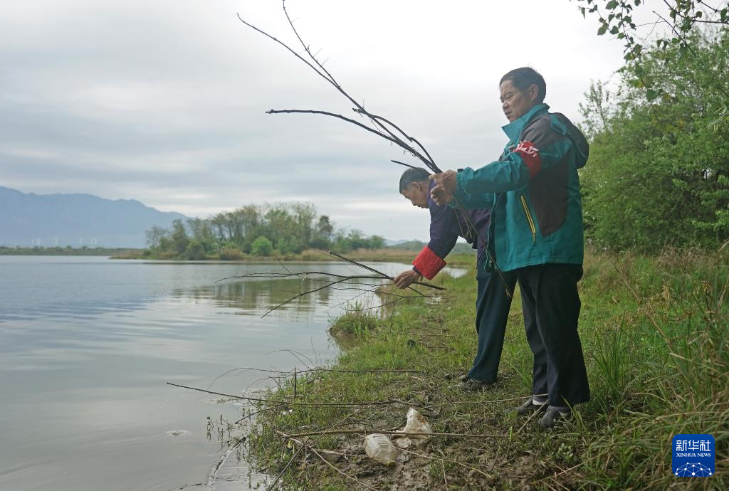 在江西省都昌县达子咀村,村民徐国松(右)捡拾树枝放在湖边,方便苍鹭取材筑巢(4月9日摄)。