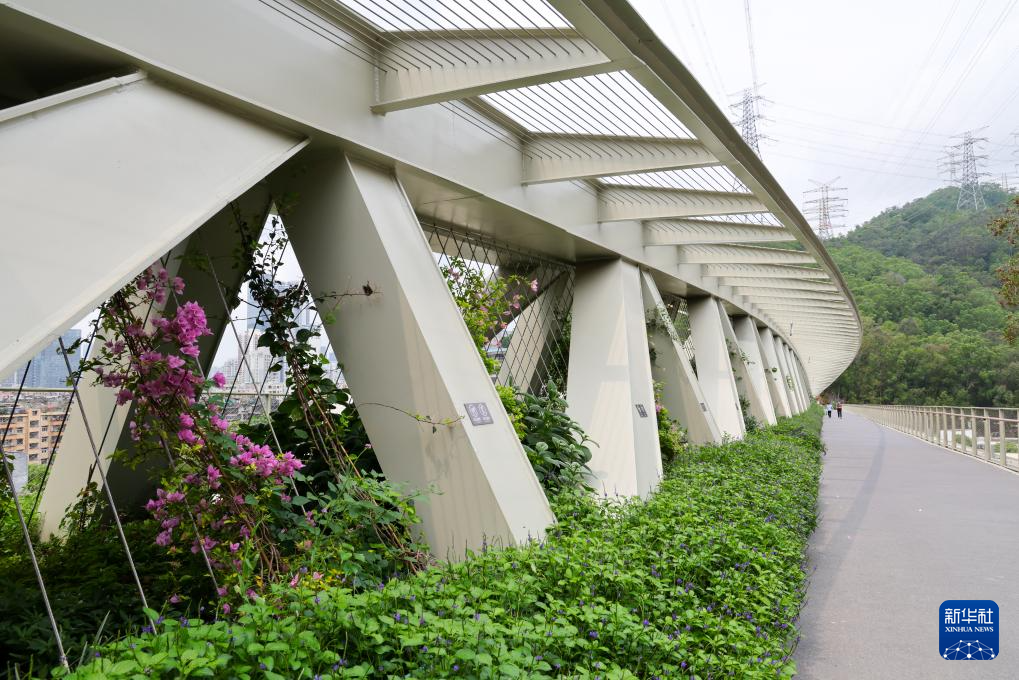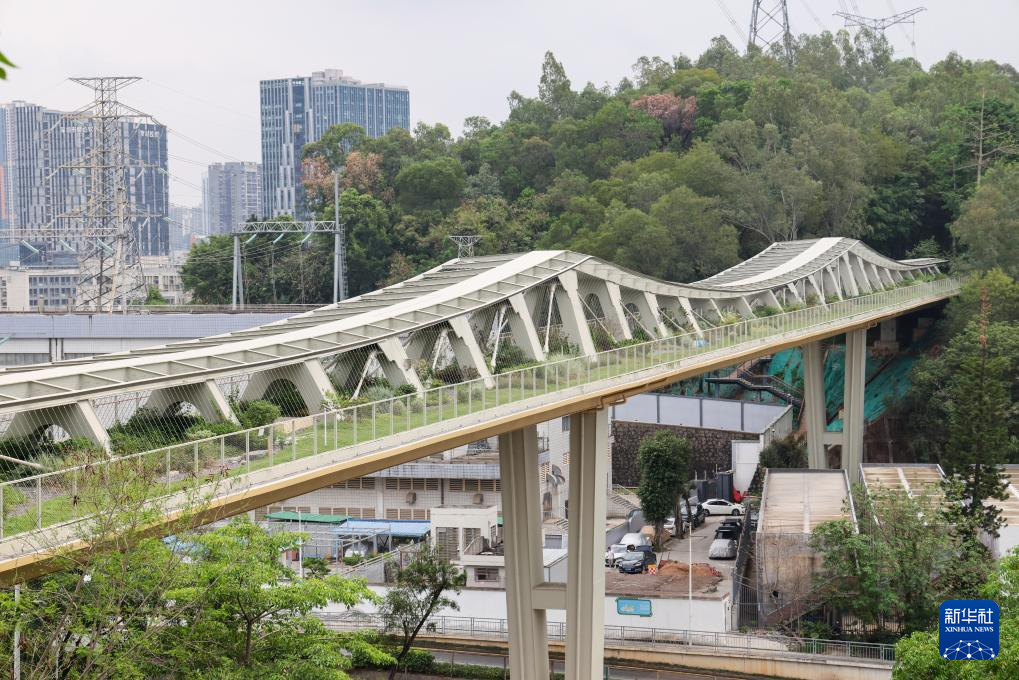 这是深圳鲲鹏径一号桥,是深圳首座集郊野径步道和野生动物保护生态廊道于一体的廊桥,修复了深圳中部山脉最大生态割裂带,为区域物种迁移、繁衍提供了安全通道,实现了梅林山—银湖山山林绿地组团的生态系统融合(无人机照片,4月21日摄)。