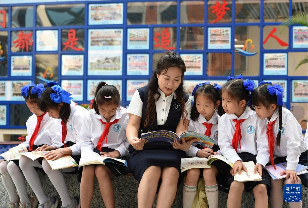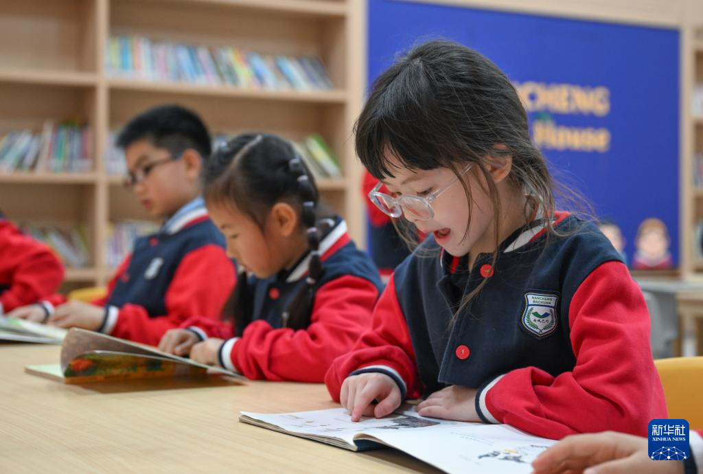 4月23日,在广西南宁市滨湖路小学教育集团滨湖校区,学校师生在阅读书籍。