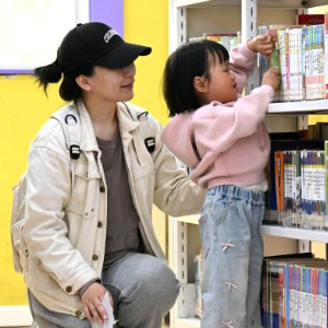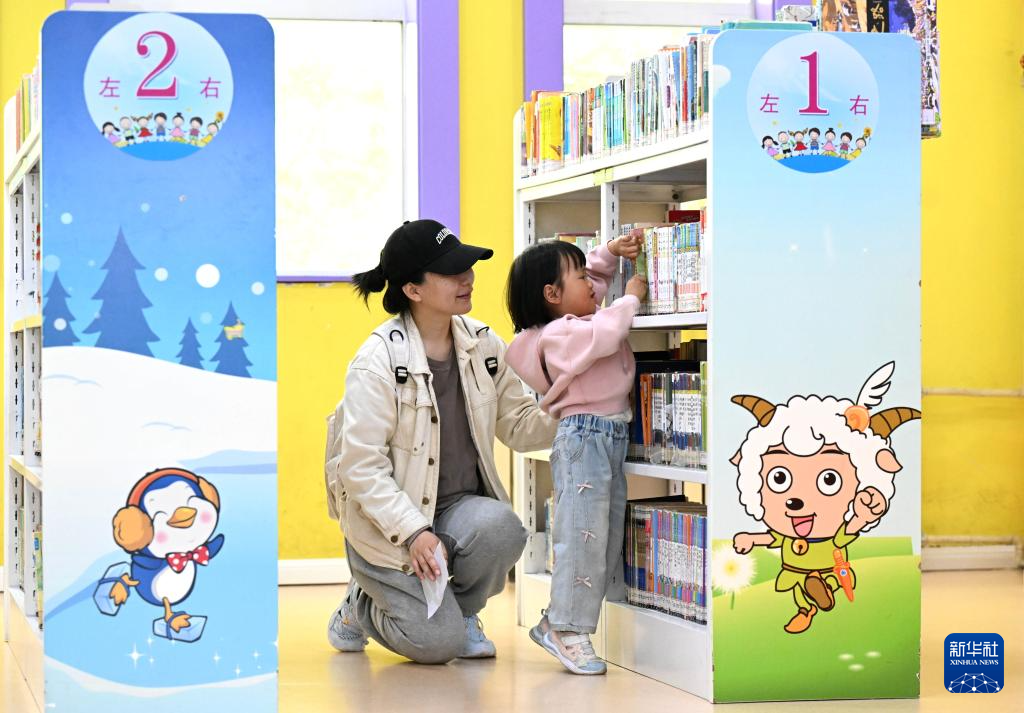 4月23日,小朋友和家长在河北省石家庄市图书馆少儿区阅读。