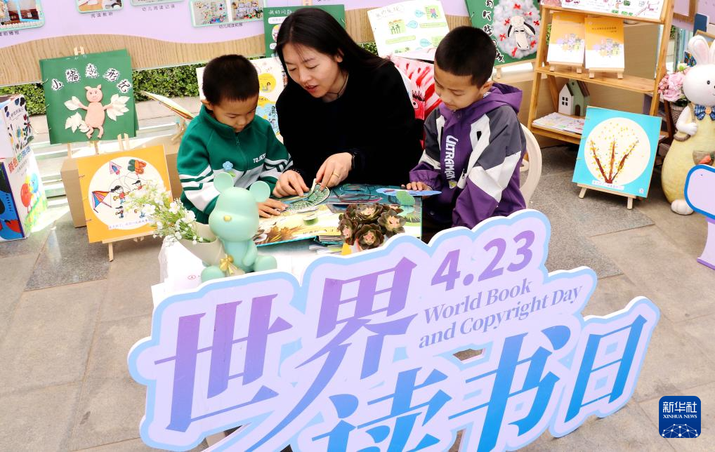 4月23日,小朋友和家长在河北省石家庄市图书馆儿童区阅读。