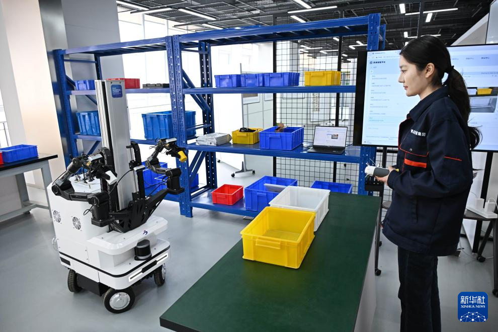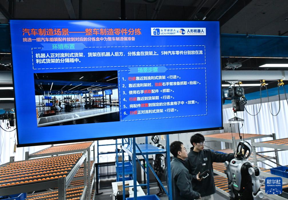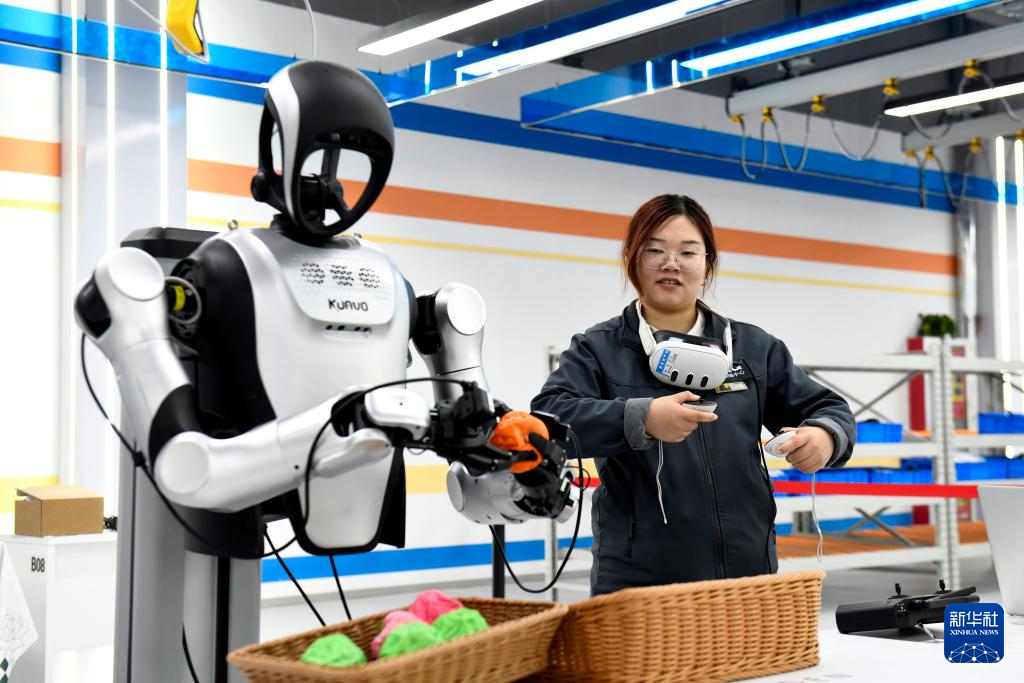 4月22日,在青岛市具身智能机器人公共训练场,训练师马婕在仓储场景内指导机器人训练。