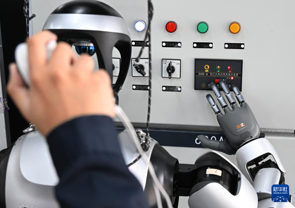 4月22日,在青岛市具身智能机器人公共训练场,训练师在工业巡检场景内指导机器人进行训练。