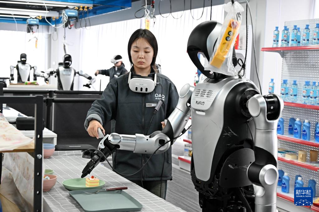 4月21日,在济南市平阴县智创空间孵化园人形机器人数据训练中心,具身智能训练师赵一琳在“生活服务场景——台面清洁”训练机器人。
