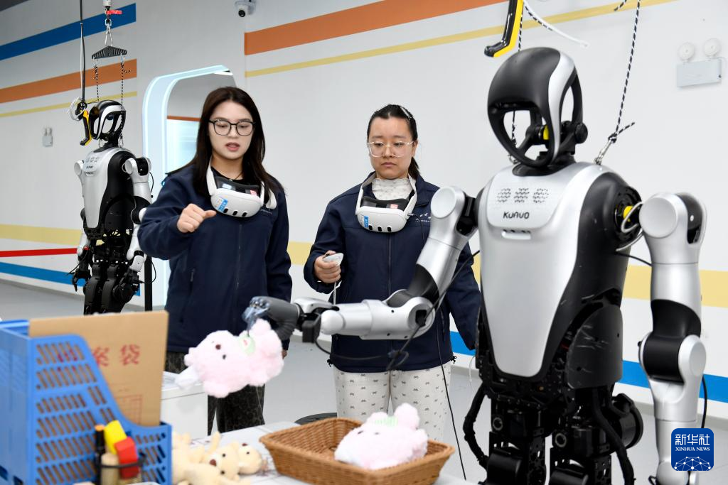 4月21日,在济南市平阴县智创空间孵化园人形机器人数据训练中心,具身智能训练师赵一琳(左)和同事在交流。