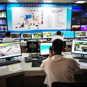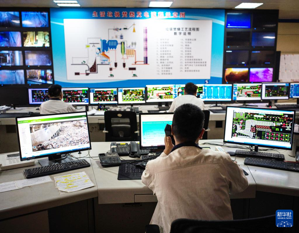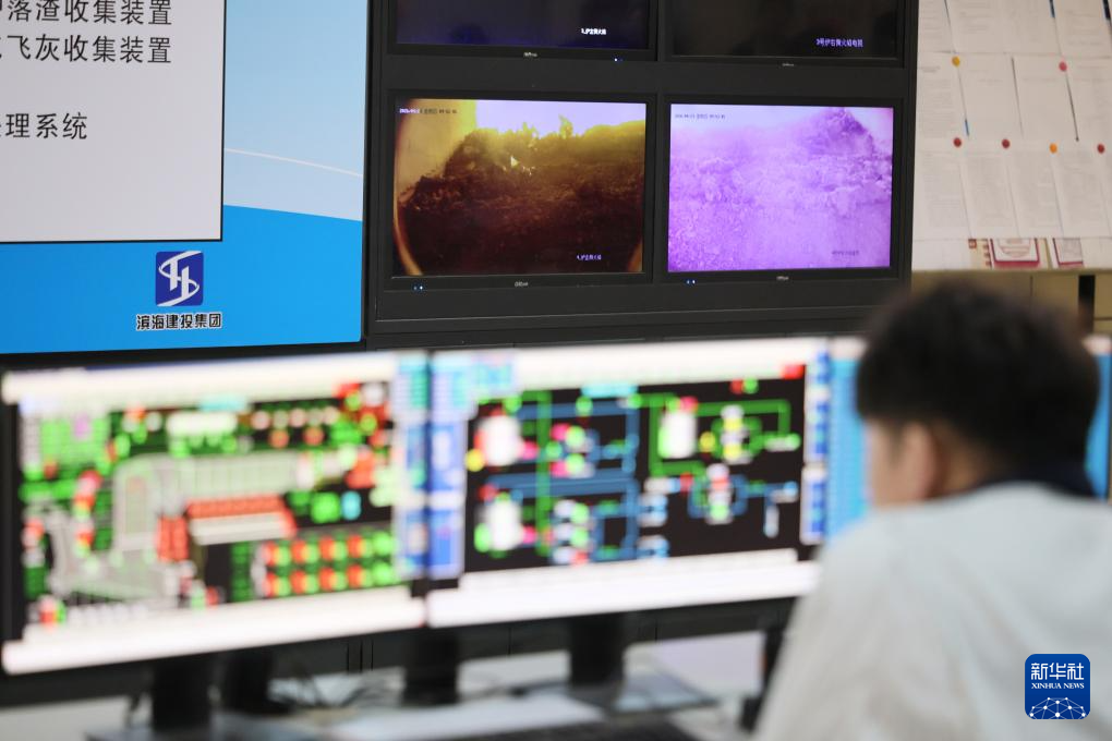 4月23日,工作人员在天津滨海新区循环经济产业园垃圾焚烧发电厂中控室工作。
