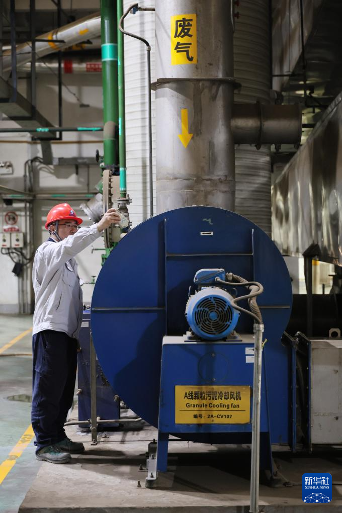 4月23日,工作人员在天津滨海新区循环经济产业园市政污泥干化处理厂检查设备运转情况。