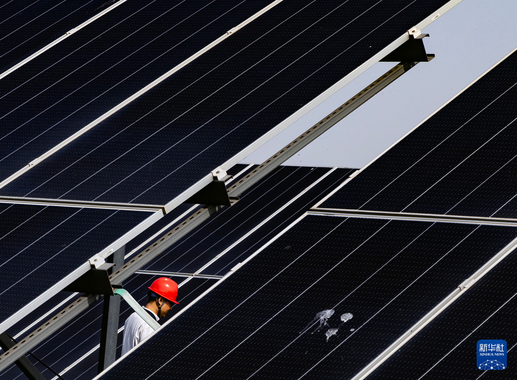 4月23日,工作人员在天津滨海新区循环经济产业园光伏板间巡查。