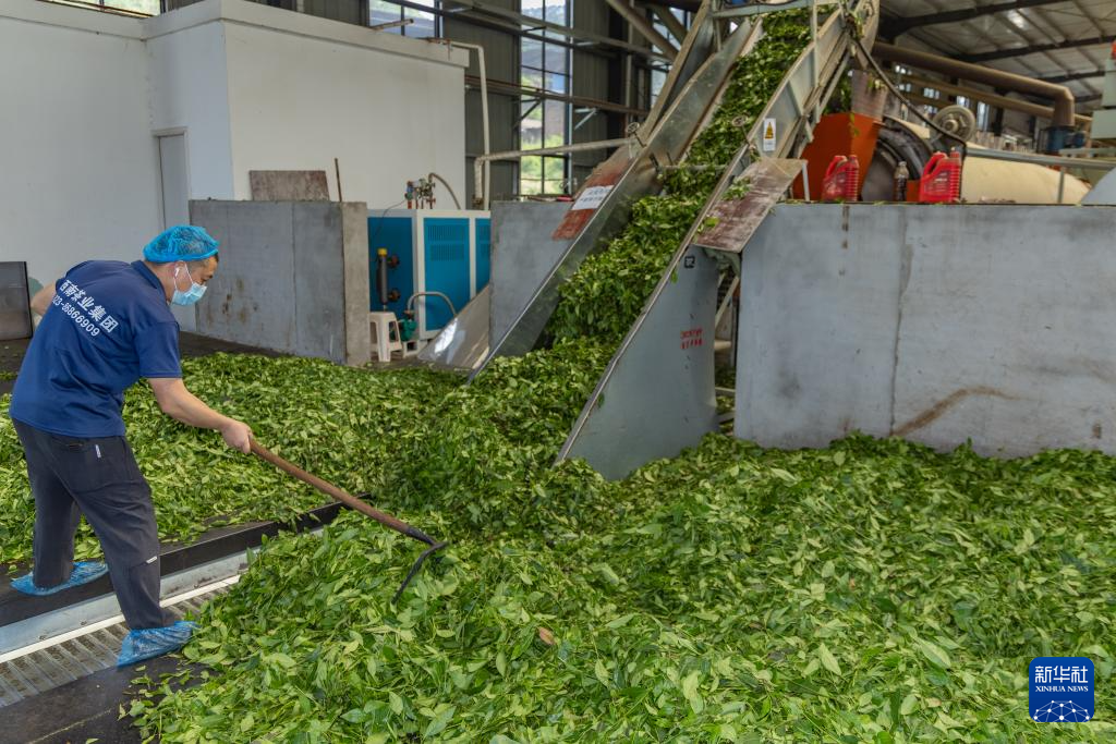 4月24日,在重庆市永川区红炉镇重庆西南茶叶集团,工人将采收回来的夏秋茶叶放进机器传送带。