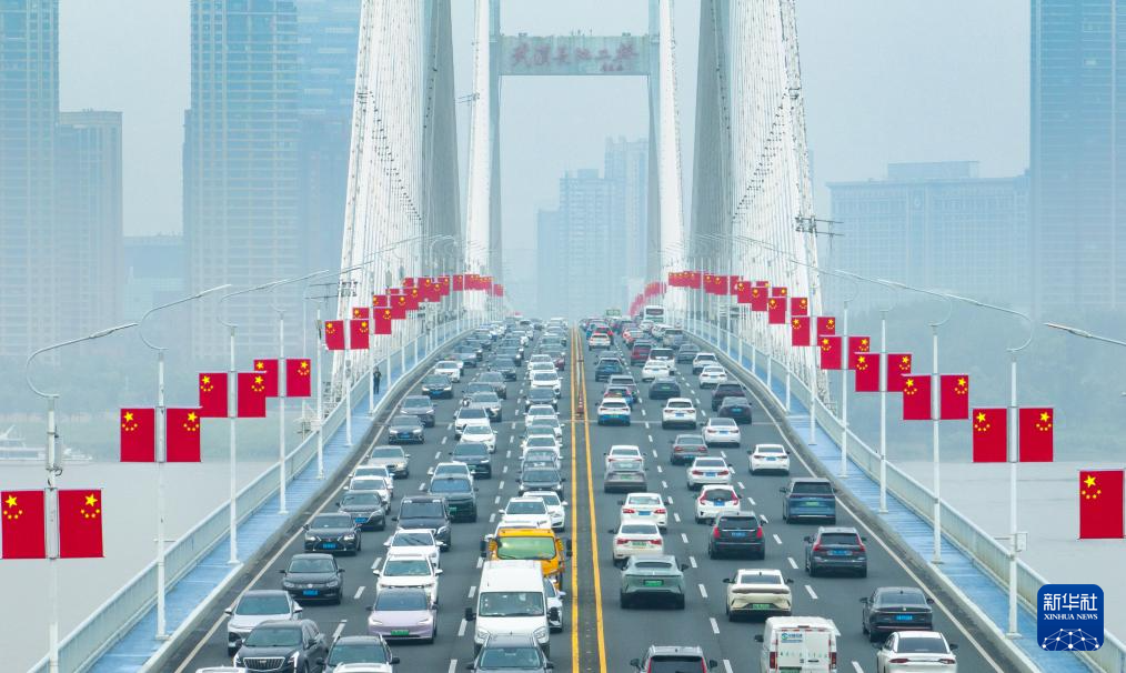 2025年10月1日,车辆行驶在武汉长江二桥上(无人机照片)。