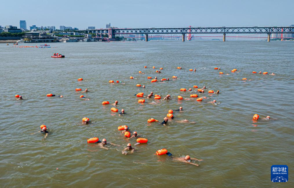 2025年7月16日,选手们横渡长江(无人机照片)。当日,第50届武汉渡江节在长江武汉段举行。