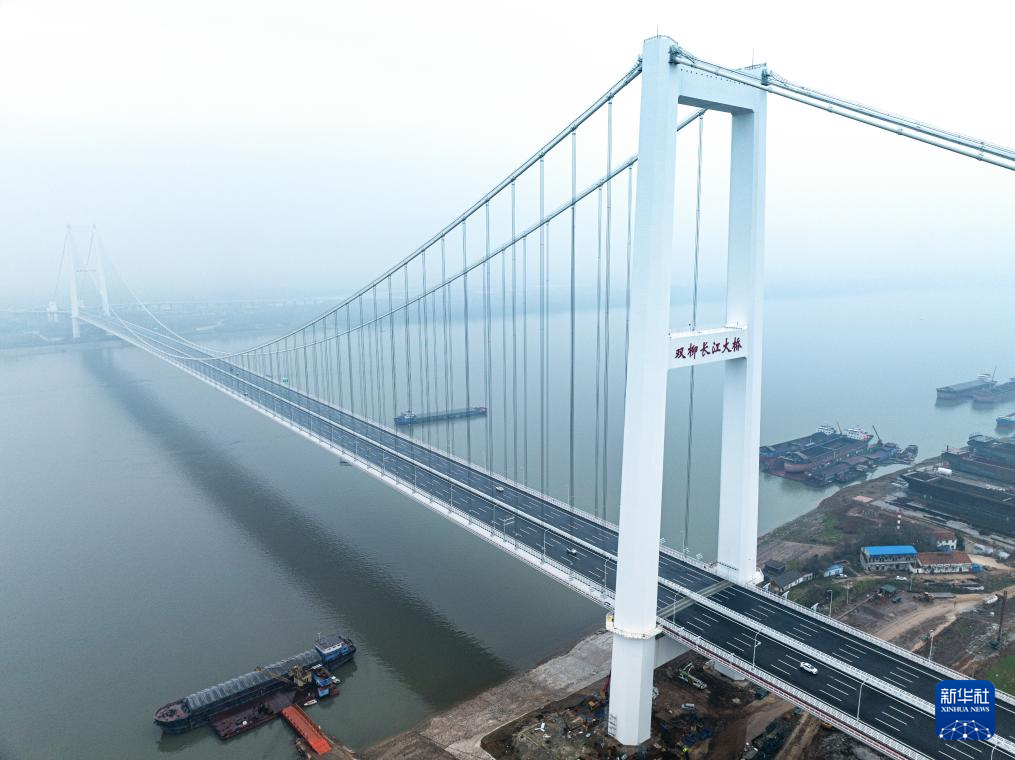 2026年3月20日,双柳长江大桥正式通车(无人机照片)。双柳长江大桥桥址下游2公里,便是长江江豚频繁出没的栖息地。为给江豚留足生存空间,大桥没有采用在江中设墩的传统方案,而是设计为“一跨过江”,所有桥墩均建在陆地。