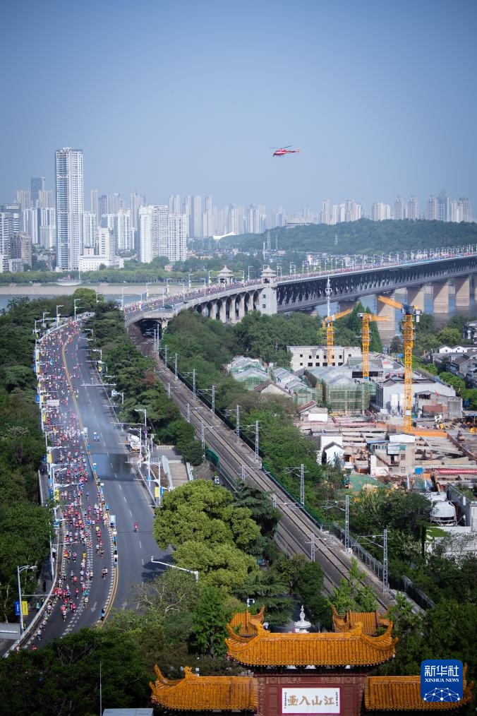 2023年4月16日,武汉马拉松参赛选手经过武汉长江大桥。