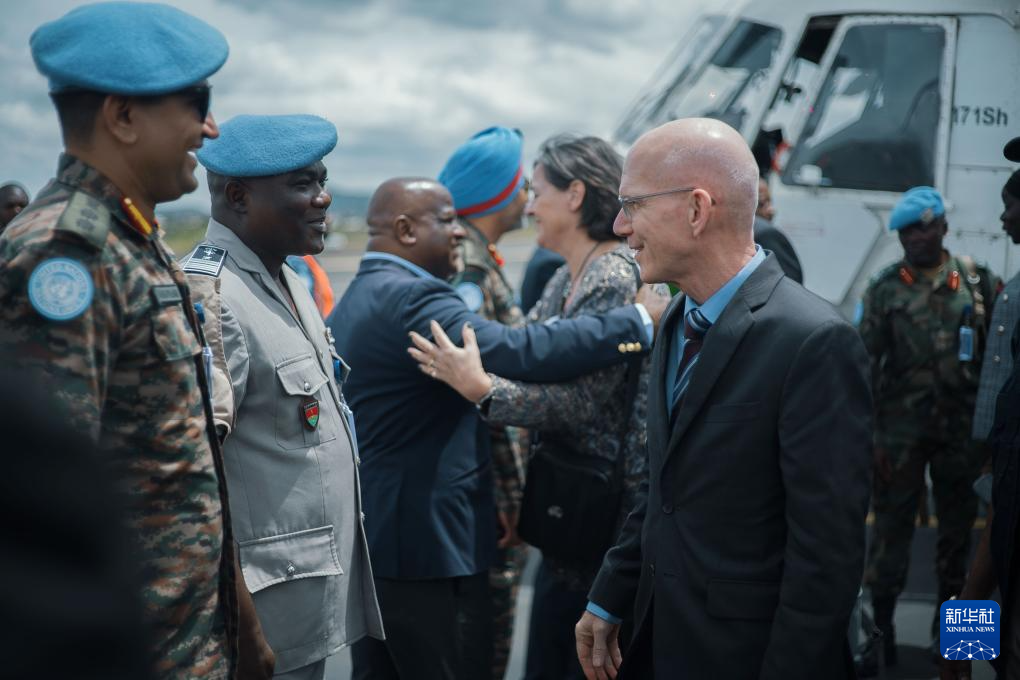 4月24日,联合国刚果(金)稳定特派团(联刚稳定团)团长詹姆斯·斯旺(前右)抵达刚果(金)北基伍省首府戈马。