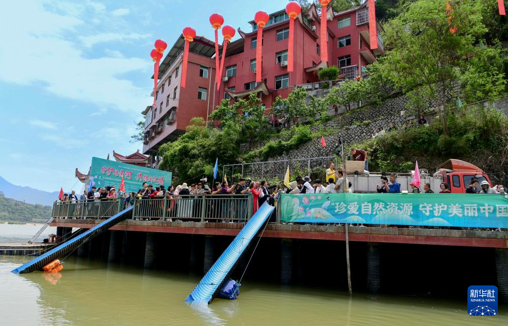 4月25日,志愿者将分装好的国家二级保护野生动物胭脂鱼鱼苗放入江水中。