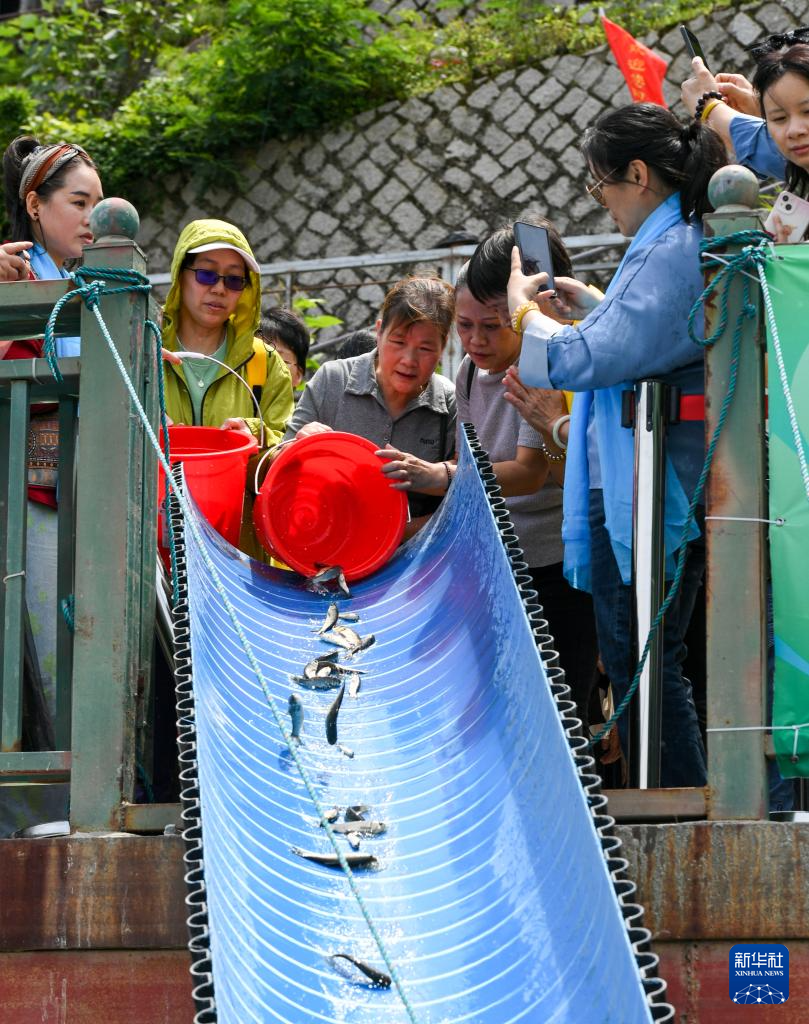 志愿者将分装好的本地鱼苗放入江水中(4月25日摄)。