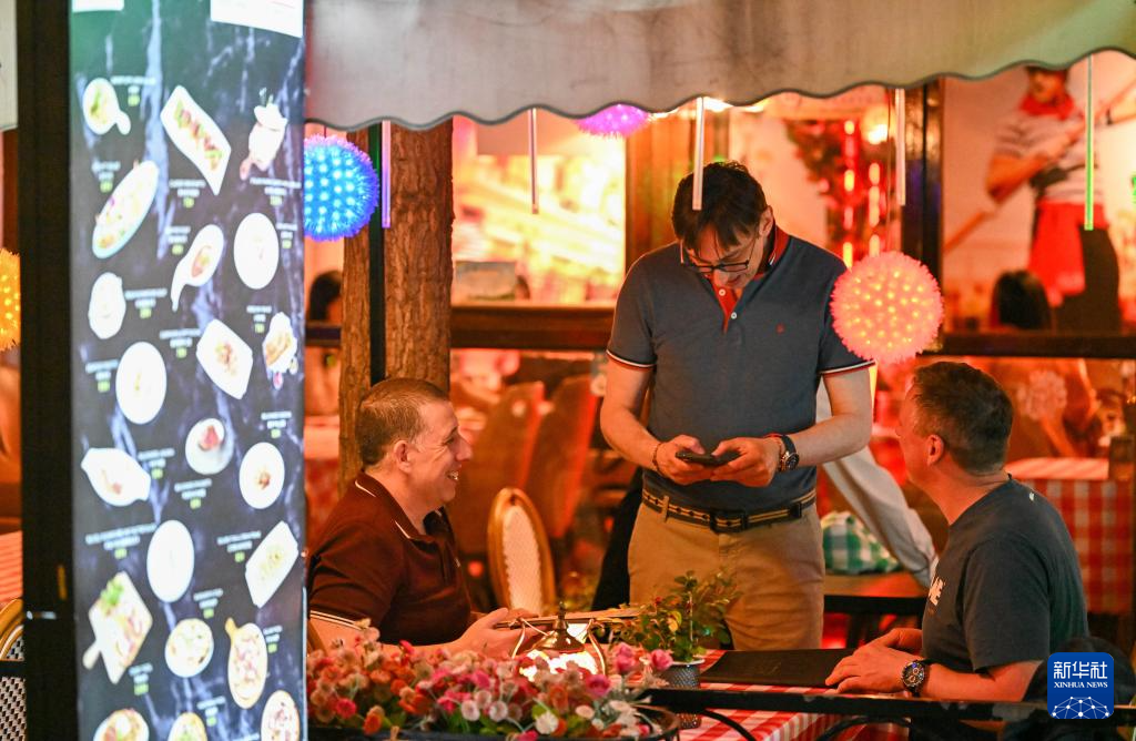 外籍游客在天津意式风情区的一家西餐厅点餐(4月24日摄)。