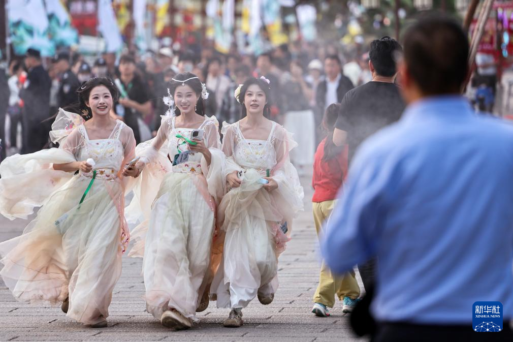 4月25日,在陇南市武都区万象街举行的沉浸式快闪活动中,身着古装的文旅达人在街上游览推介。