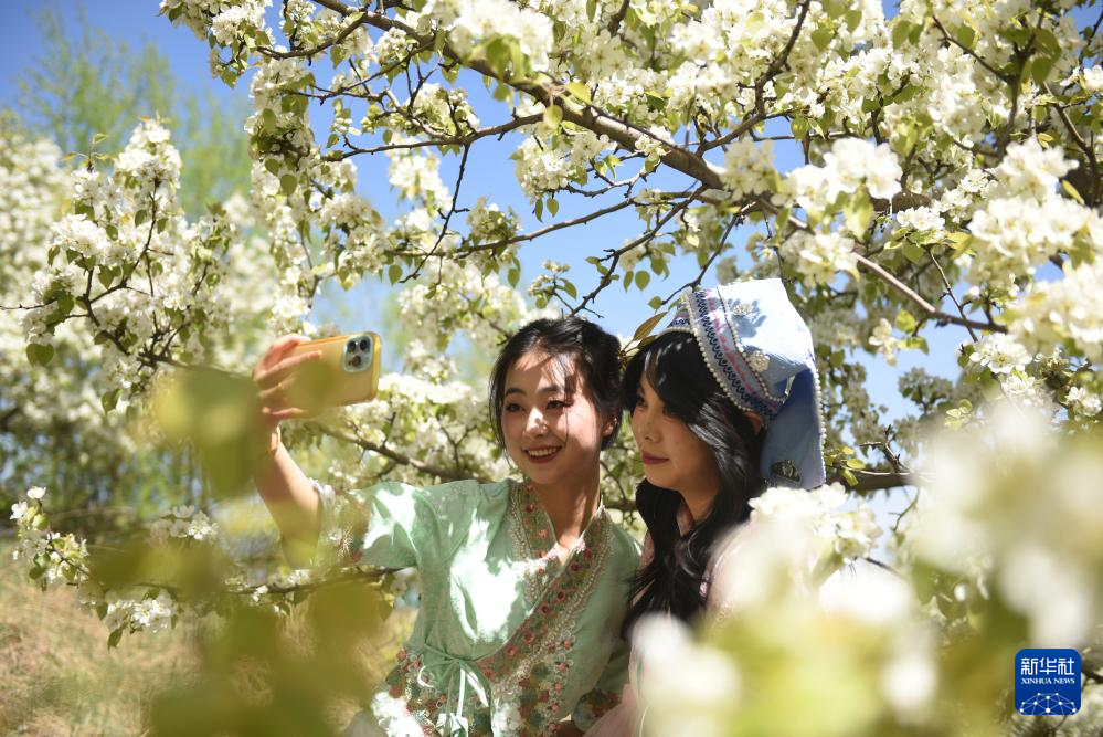 4月26日,游客在甘肃省临夏回族自治州和政县达浪乡李家坪村的梨园里赏花拍照。