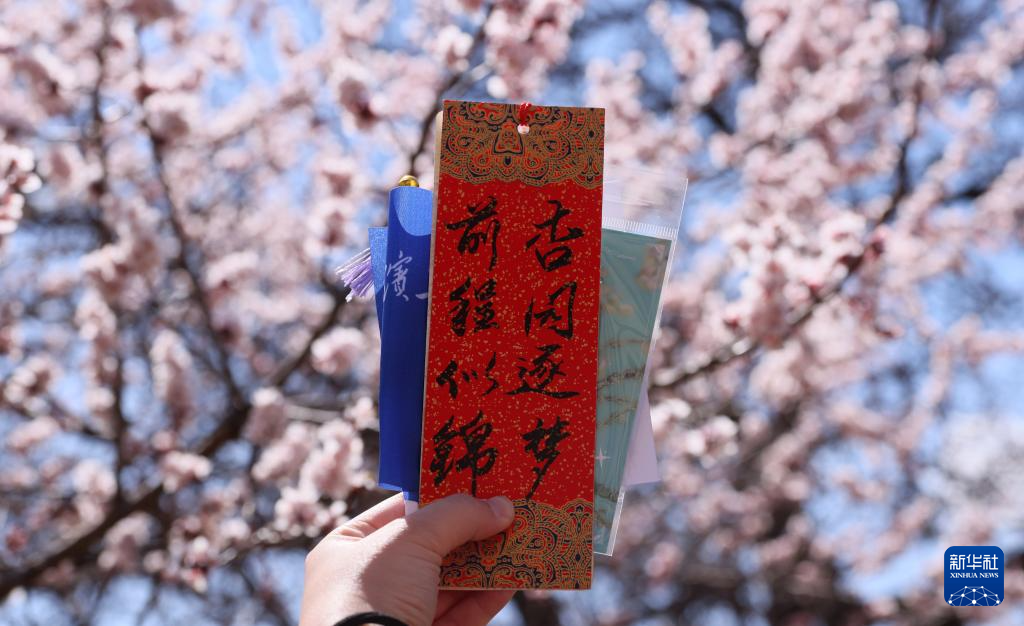 4月26日,在哈尔滨工程大学,一名学生拿着学长手写的书签“打卡”盛开的杏花。