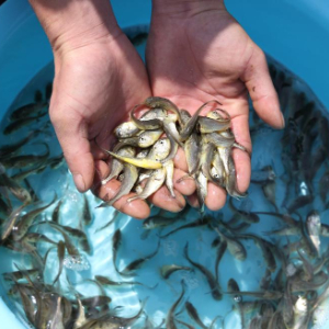 4月25日,在福建省宁德市三都澳海上养殖区,工人展示大黄鱼鱼苗。
