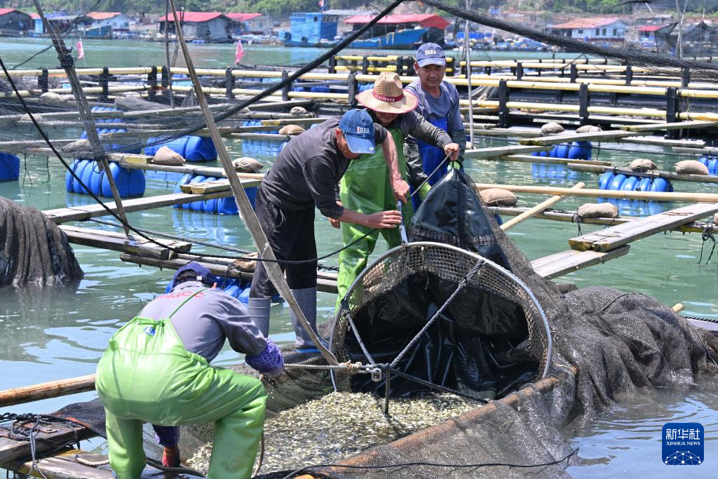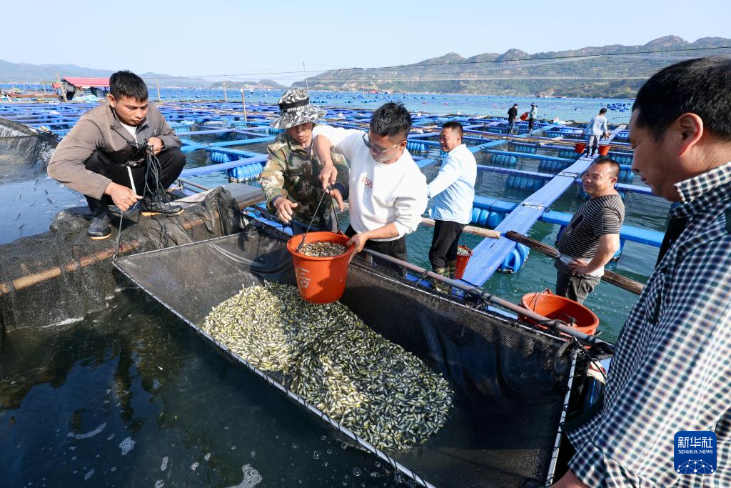4月25日,在福建省宁德市霞浦县下浒镇海上养殖区,养殖户将大黄鱼鱼苗投放至渔排。
