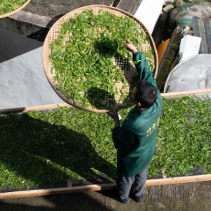 4月25日,在黄山市黄山区新明乡猴坑村中潭村民组,茶农叶良金在查看鲜叶的摊放程度。